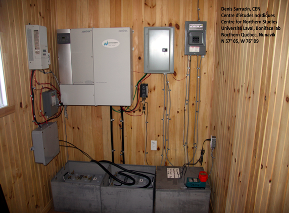 The off-grid PV systems each comprised 1.4 kWp of SolarWorld monocrystaline solar modules, Xantrex XW MPPT 60A charge controller and 4kW / 24V inverter charger, 15 kWh GEL battery banks, mounting hardware and accessories. These autonomous systems serve to power equipment located at CEN installations in the Boniface and Lac à l'Eau Claire sectors. CEN recognized the advantage of low maintenance off-grid PV systems over diesel generators, which require costly maintenance, repair and operation. Transporting diesel fuel to remote areas, often by air during the wintertime, is particularly costly and increases project risk. Matrix Energy also supplied low voltage DC appliances, including heavy duty pressure pumps and top loading fridges and freezers. The seven PV systems connected to Hydro-Quebec's utility grid each comprise 4.2 kWp of SolarWorld monocrystaline solar modules, Xantrex 5 kW grid-tie inverter and monitor, mounting hardware and accessories. These systems allow CEN to reduce their electric utility costs on a monthly basis, and were installed in the Kuujjuarapik, Umiujaq and Salluit sectors of the province. |